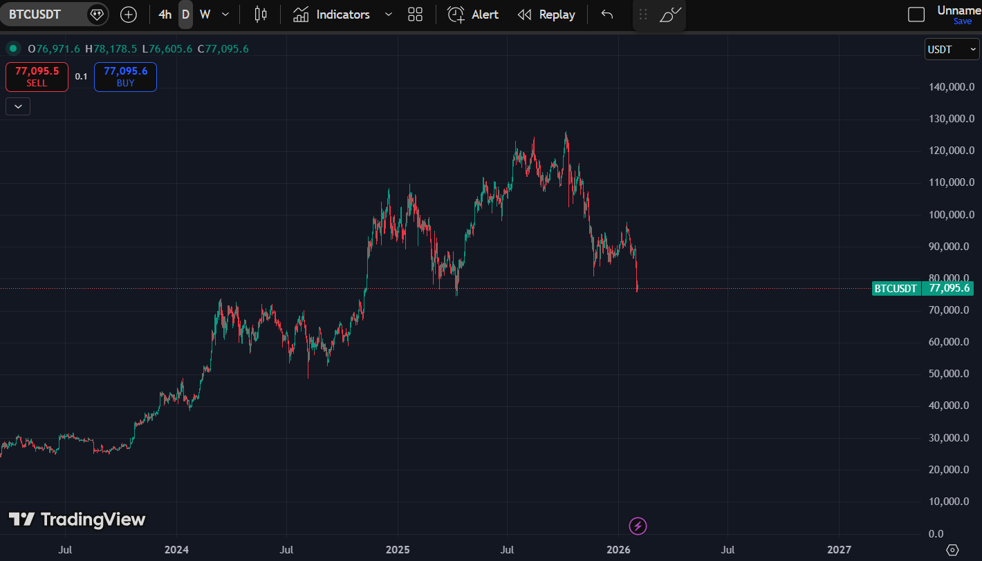 Bitcoin has pulled back aggressively from the highs and is now testing the HTF support zone around 73k–76k.