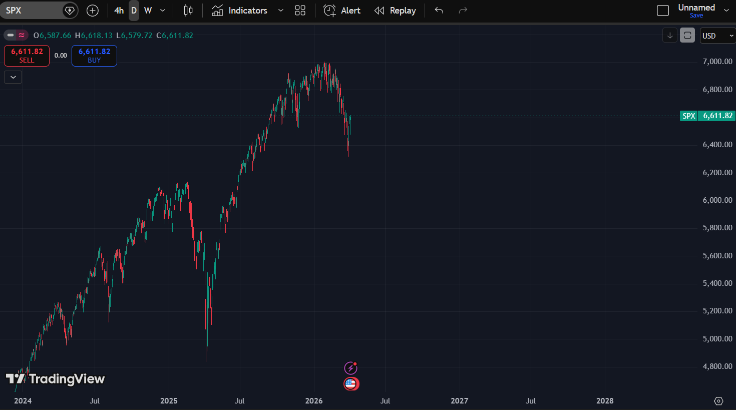 Now price is sitting around 6,611, bouncing weakly.